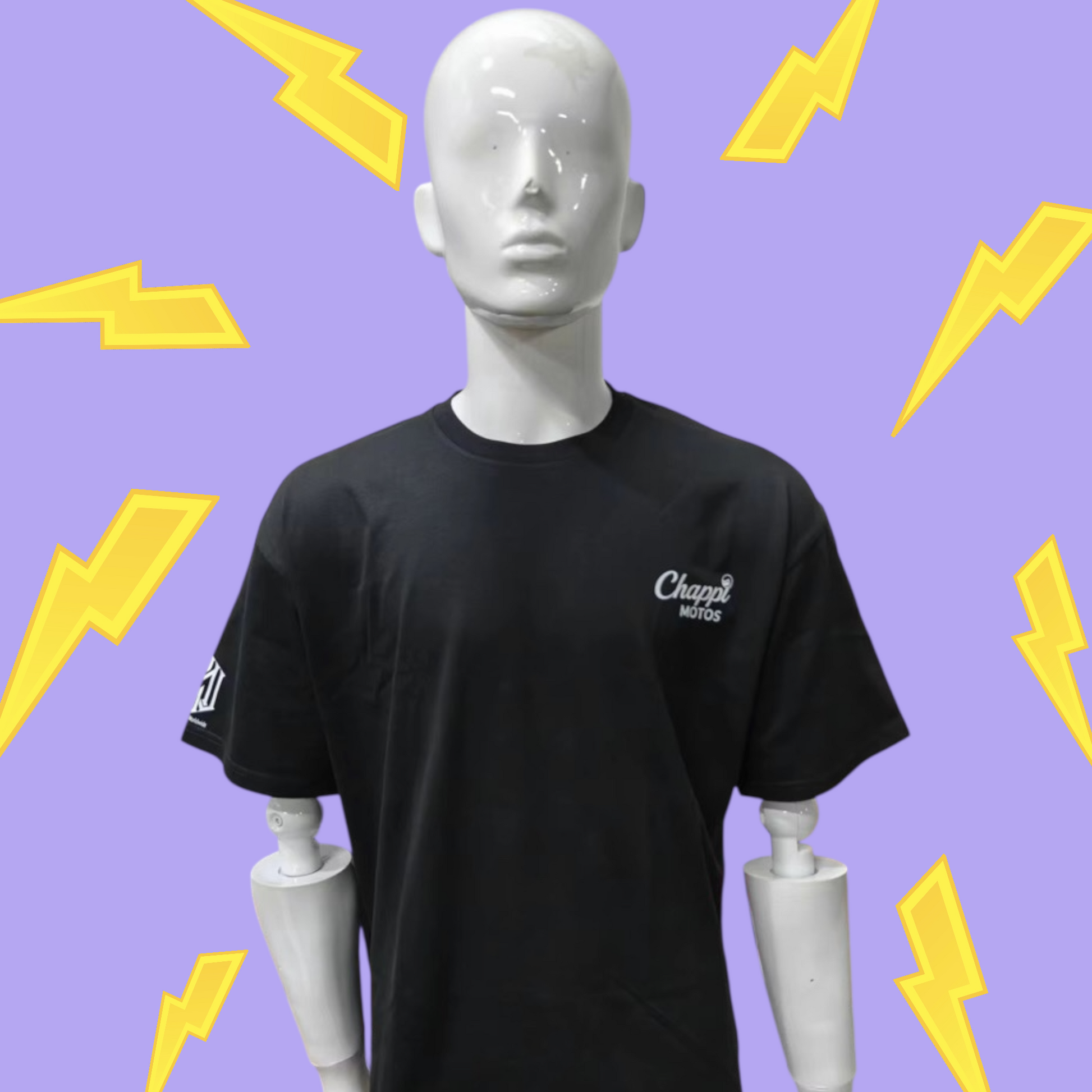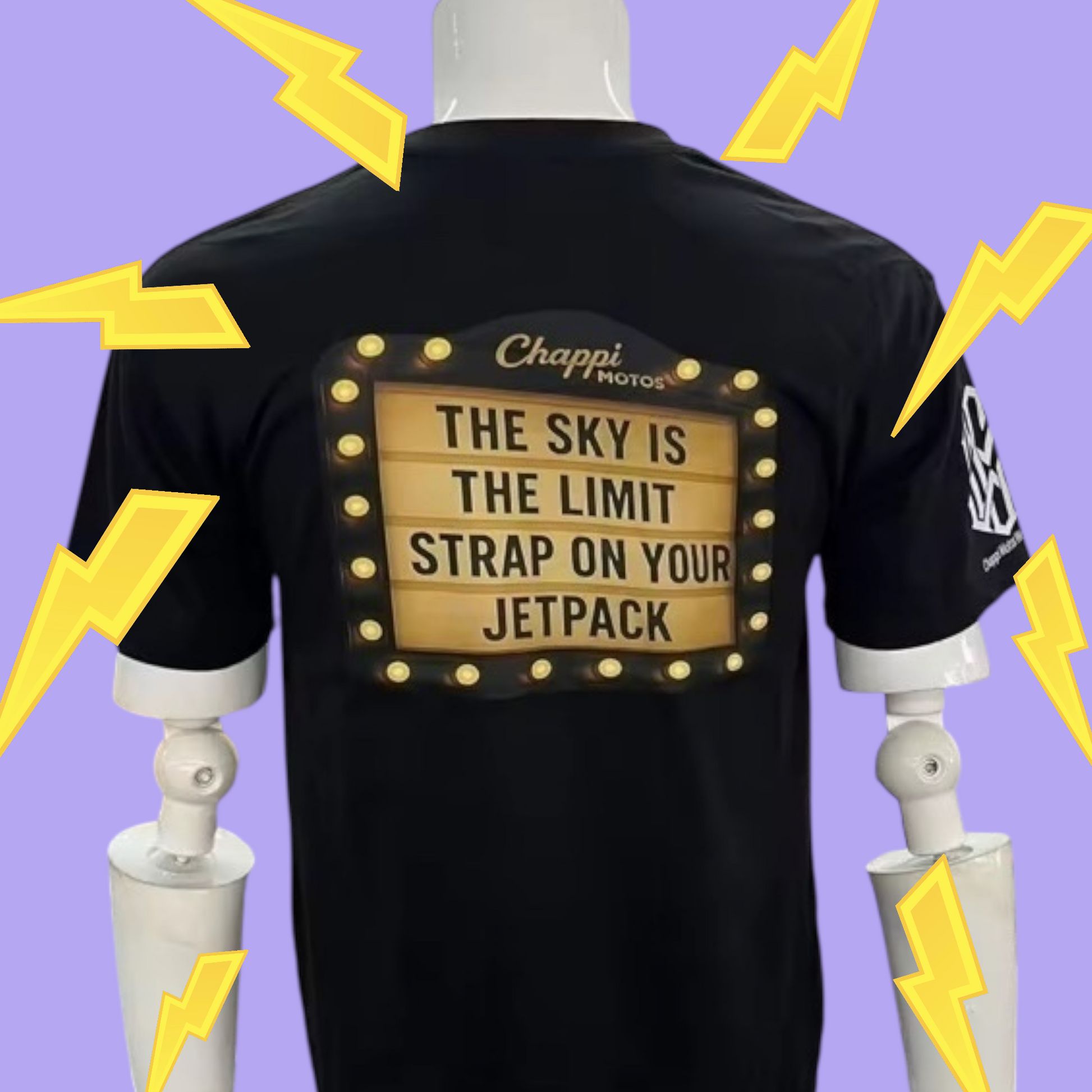 The ActionPack T-shirt delivers bold graphic storytelling with a cinematic edge. Featuring a striking movie light board design on the back emblazoned with the iconic Jetpack slogan, this piece captures the spirit of adventure and innovation. The Chappi Motos Worldwide Logo adorns the sleeve, establishing authentic brand identity. Crafted in premium all-black fabric, it offers versatility and timeless appeal while making a statement that resonates with riders and enthusiasts who understand the culture